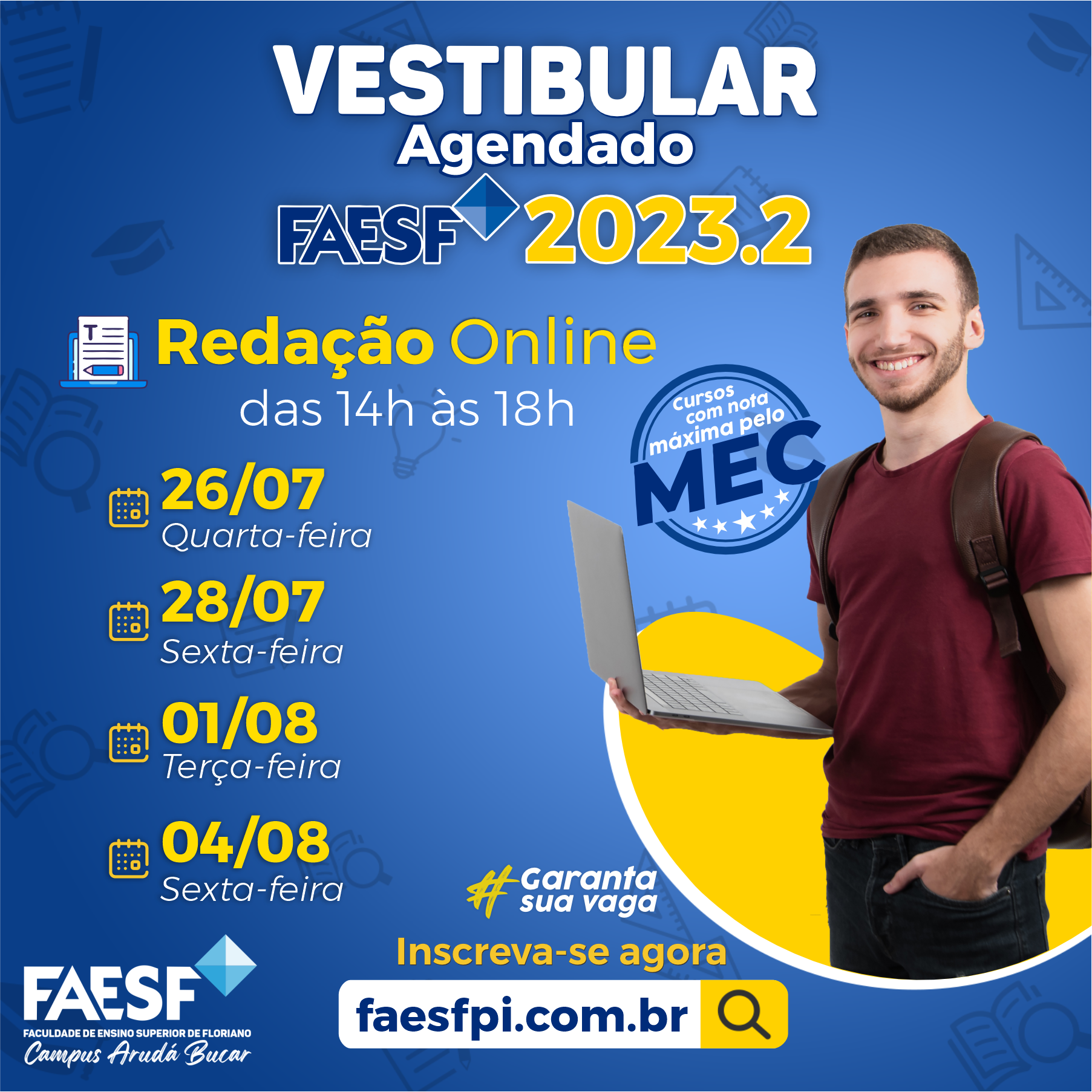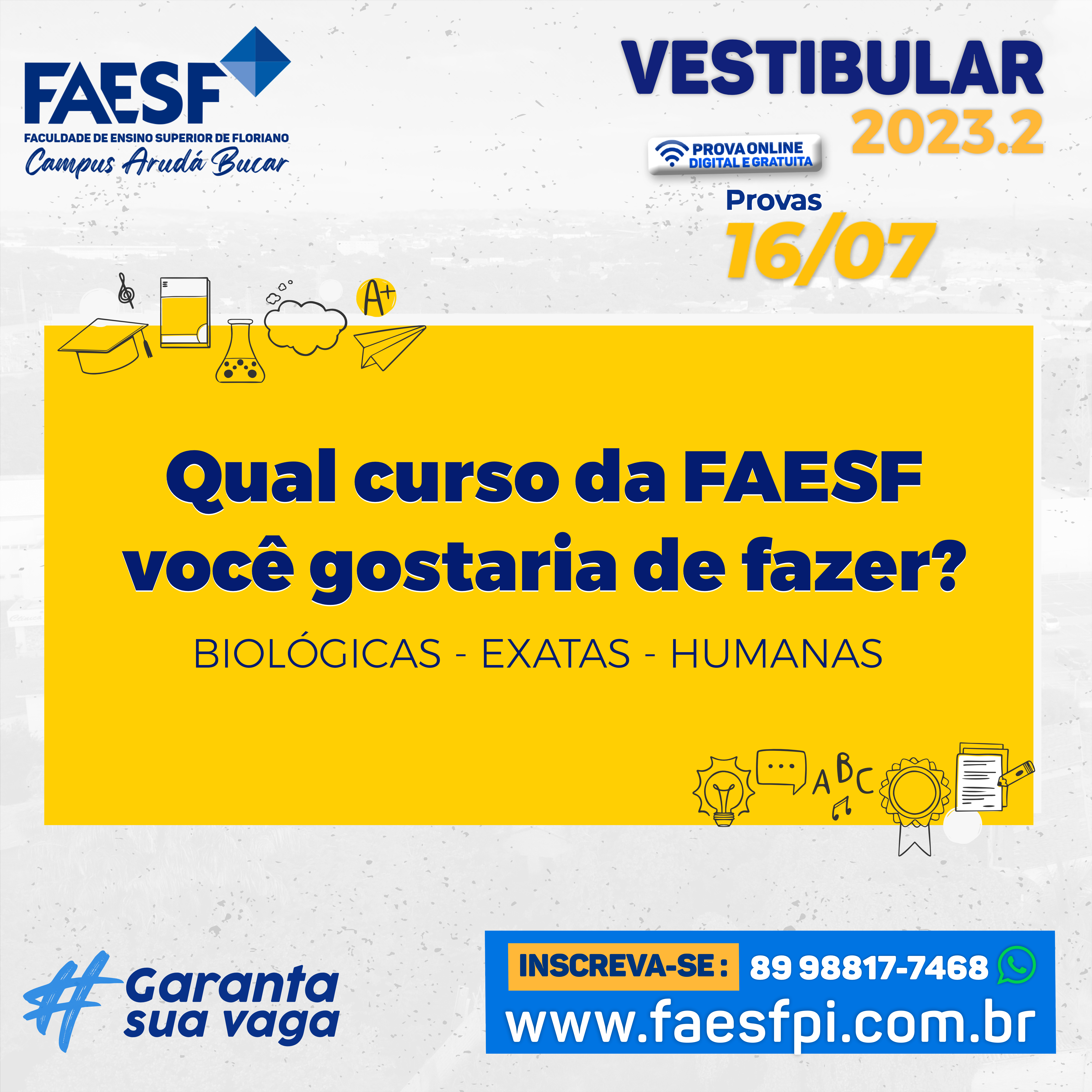 Agende sua prova para o Vestibular FAESF 2023.2 Escolha a data da sua Redação, online e gratuita, conquiste sua carreira de sucesso na FAESF. LINK DE INSCRIÇÃO Cursos presenciais:...
