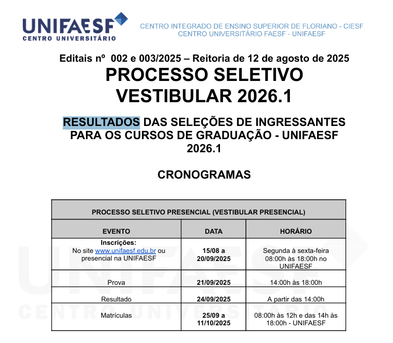 O Centro Universitário UNIFAESF parabeniza calorosamente todos os aprovados no Vestibular 2026.1, realizado no dia 21 de setembro de 2025. 🎓 Vocês fazem parte de um grupo que escolheu...