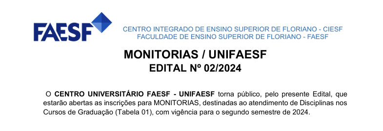 ??✨ Boas notícias para os estudantes da FACULDADE DE ENSINO SUPERIOR DE FLORIANO – FAESF! ? O edital de monitorias para o período letivo 2024.2 está oficialmente publicado! ??...