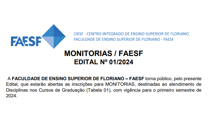 ??✨ Boas notícias para os estudantes da FACULDADE DE ENSINO SUPERIOR DE FLORIANO – FAESF! ? O edital de monitorias para o período letivo 2024.1 está oficialmente publicado! ??...