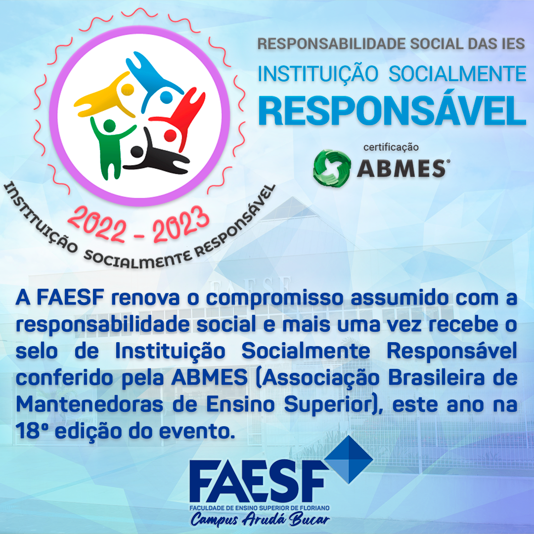 A Faculdade de Ensino Superior de Floriano – FAESF recebeu nesta semana, o Selo Instituição Socialmente Responsável, da Associação Brasileira de Mantenedora do Ensino Superior (ABMES), certificando a participação...
