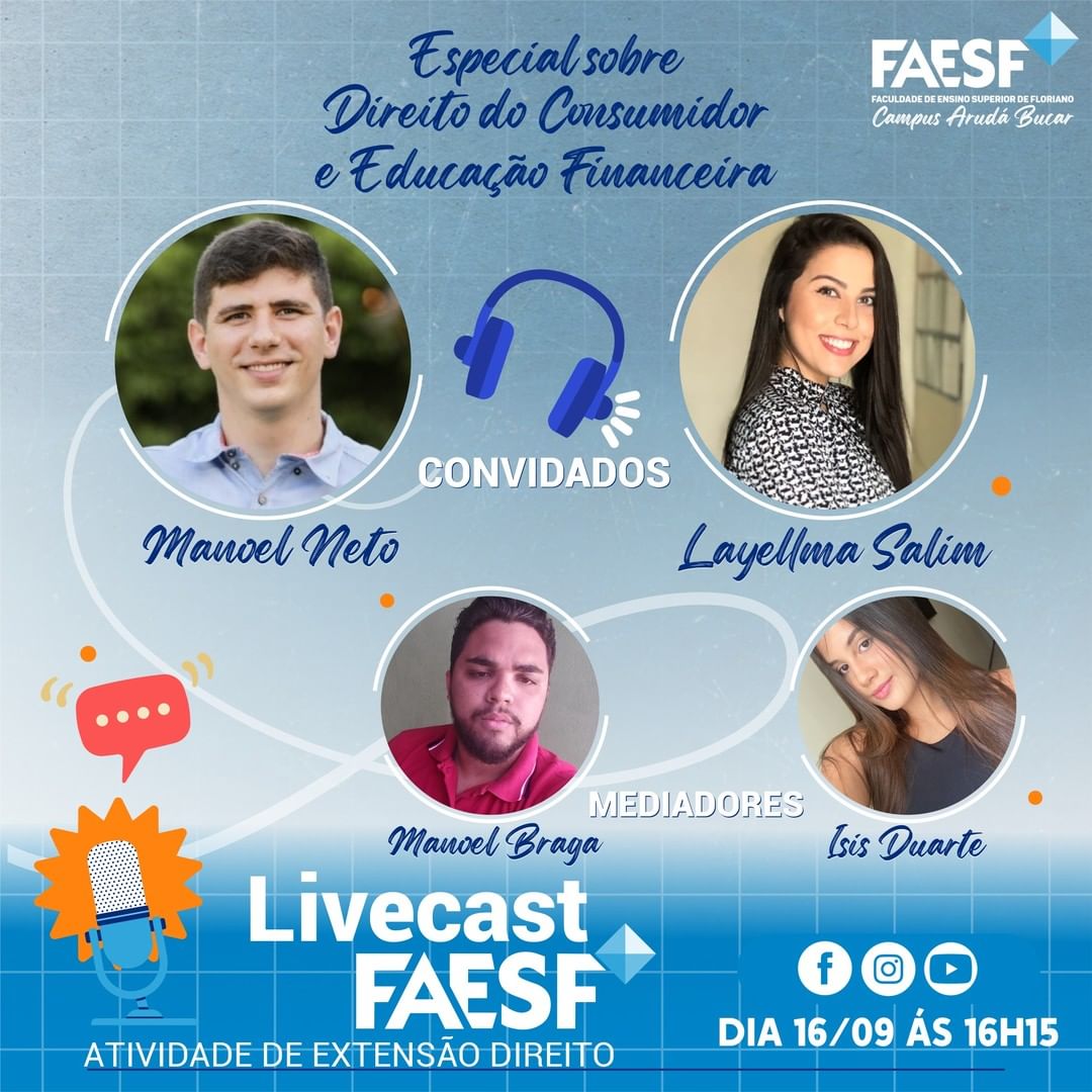 Acadêmicos do II Bloco de Direito, através de Projeto de Extensão, promovem Livecast voltado para o Direito do Consumidor e Educação Financeira. Palestrantes : Dr.Manoel Oliveira Neto Sócio administrador...