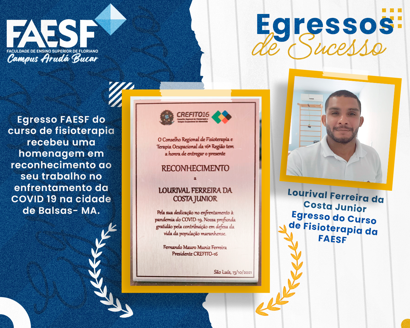 O Egresso do curso de Fisioterapia da FAESF, Lourival Ferreira da Costa Júnior, recebeu uma homenagem em reconhecimento ao seu trabalho no enfrentamento da COVID-19, na cidade de Balsas-MA....