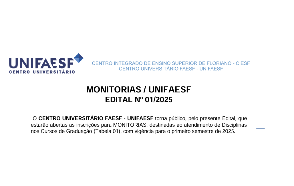 ✨ Boas notícias para os estudantes da CENTRO UNIVERSITÁRIO FAES-UNIFAESF! O edital de monitorias para o período letivo 2025.1 está oficialmente publicado! Se você é aluno dos cursos de...
