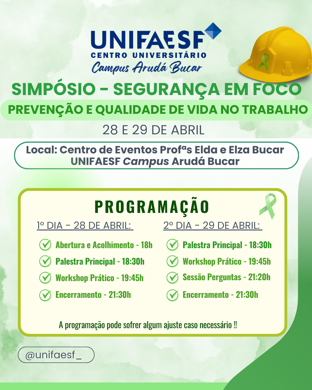O Centro Universitário FAESF – UNIFAESF, por meio do curso de Engenharia Civil, realizará nos dias 28 e 29 de abril de 2025 o simpósio “Segurança em Foco: Prevenção e Qualidade de Vida no Trabalho”, com o objetivo de ampliar o conhecimento e a conscientização sobre segurança, prevenção de riscos e qualidade de vida no ambiente profissional.