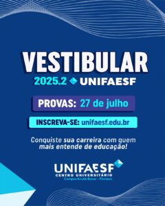 O Centro Universitário UNIFAESF parabeniza calorosamente todos os aprovados no Vestibular 2025.2, realizado no dia 27 de junho de 2025. 🎓 Vocês fazem parte de um