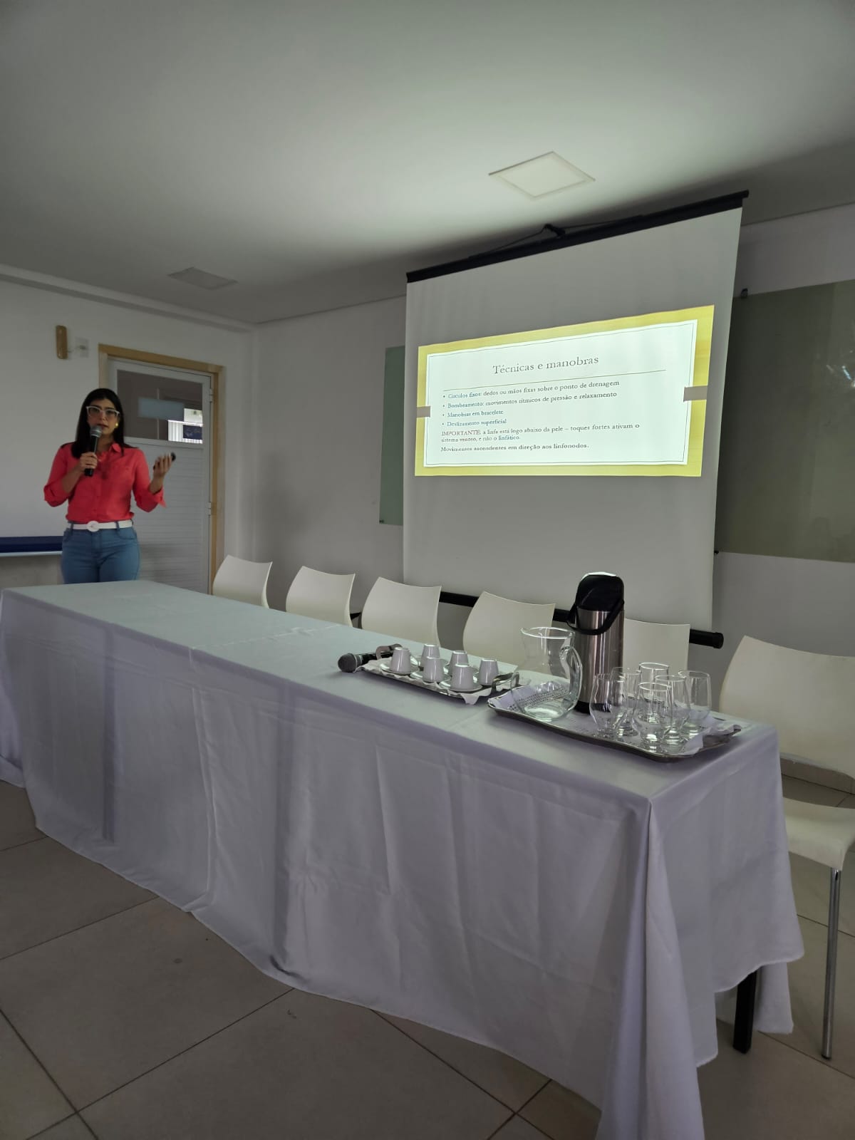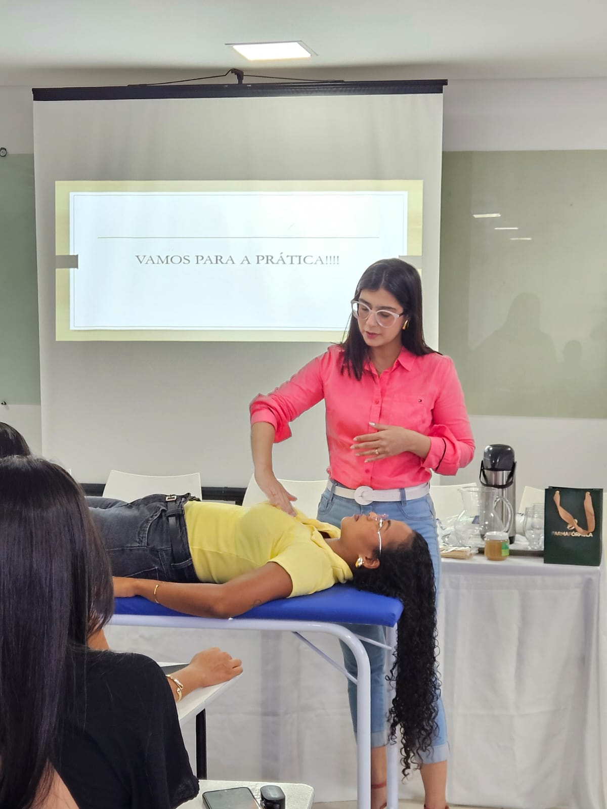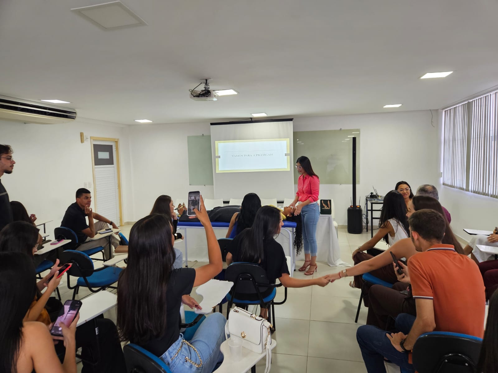 A programação teve início com o Minicurso de Drenagem Linfática, ministrado pela Dra. Maria Elvira, farmacêutica esteta e egressa do UNIFAESF. Através de slides explicativos e demonstrações práticas, os alunos compreenderam a importância do sistema linfático, suas funções de defesa, drenagem e transporte, além de aprenderem sobre as técnicas e indicações da drenagem linfática manual, destacando os cuidados, mitos e verdades sobre o procedimento.